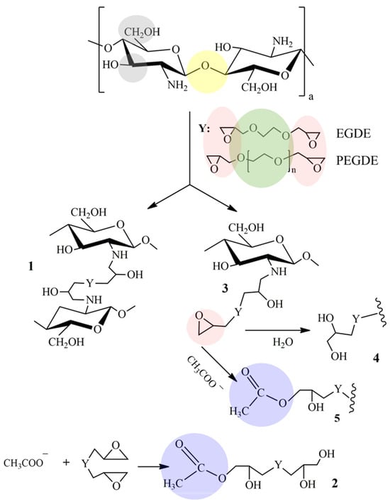 To explain the low efficiency of CH cross-linking with DEs in acetic acid solutions, we have considered the following factors: (i) decrease in amino group nucleophilicity due to protonation, when CH was dissolved at a stoichiometric excess of acid, as suggested in [22]; (ii) consumption of DEs in side reaction with acetic acid; (iii) dependence of epoxy ring-opening reactions kinetics and probability of target (cross-linking) reaction on DE chain length.