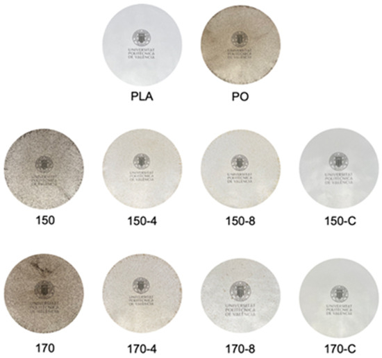 Figure 2 shows the visual appearance of the different PLA films. A naked-eye observation shows that the transparency and colour characteristics of the PLA films with the different lignocellulosic fibres differ greatly due to the presence of solid particles with different purification degrees. The films that differ the least from the PLA control would be those prepared with PLA and chlorite-bleached fibres because these are the cellulose fibres that have the highest whiteness index and cellulose purity (Table 1). This was reflected in the values of the total colour difference (ΔE*) shown in Table 1 for the net PLA film. Similar optical characteristics were observed in PLA films containing PO cellulose nanofibers [38].