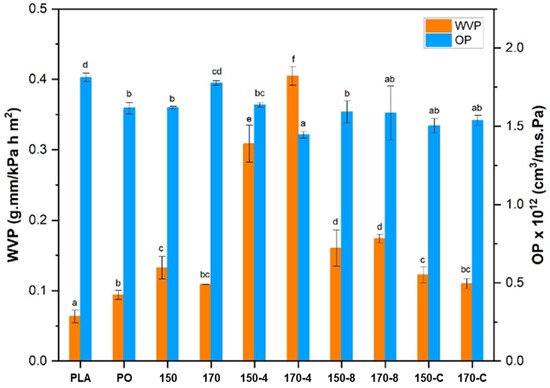 The water vapour permeability (WVP) and oxygen permeability (OP) of the PLA films are affected by lignocellulosic fibre addition. For each barrier property, different letters indicate significant differences among the samples (p < 0.05).