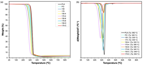 (a) Thermogravimetric analysis (TGA) curves and (b) first derivative (DTGA) curves of the PLA films with the different lignocellulosic residues.
