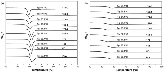 Figure 6 shows the first and second heating scans of the different PLA films, indicating the Tg values (mid-point) obtained in each case. For a determined sample, even for net PLA, slight differences in the Tg values were observed in the first and second scans, where the values of the former were always slightly greater, which can be attributable to the thermal history and aging of the material. Considering the Tg values of the second scan when the thermal history was erased, a significant decrease (ΔTg: 3–4 °C) in the Tg values of composites relative to the net PLA was only observed in samples containing PO or 170 fibres. The latter suggests that some compounds of these non-purified fibres could migrate into the polymer matrix, provoking a certain plasticising effect. Frone et al. [50] reported that the Tg measured by DSC is not sensitive enough to detect modifications in the restriction of PLA mobility provoked by nanofillers since the low content of nanofillers only involves a small fraction of the PLA chains. Similar effects can be expected for microfillers, such as the cellulosic fractions in the present study.