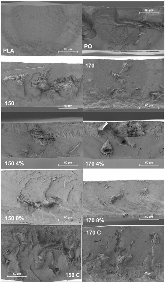 HRFESEM images (×450) of the cross-sections of PLA films with the different incorporated lignocellulosic residues.