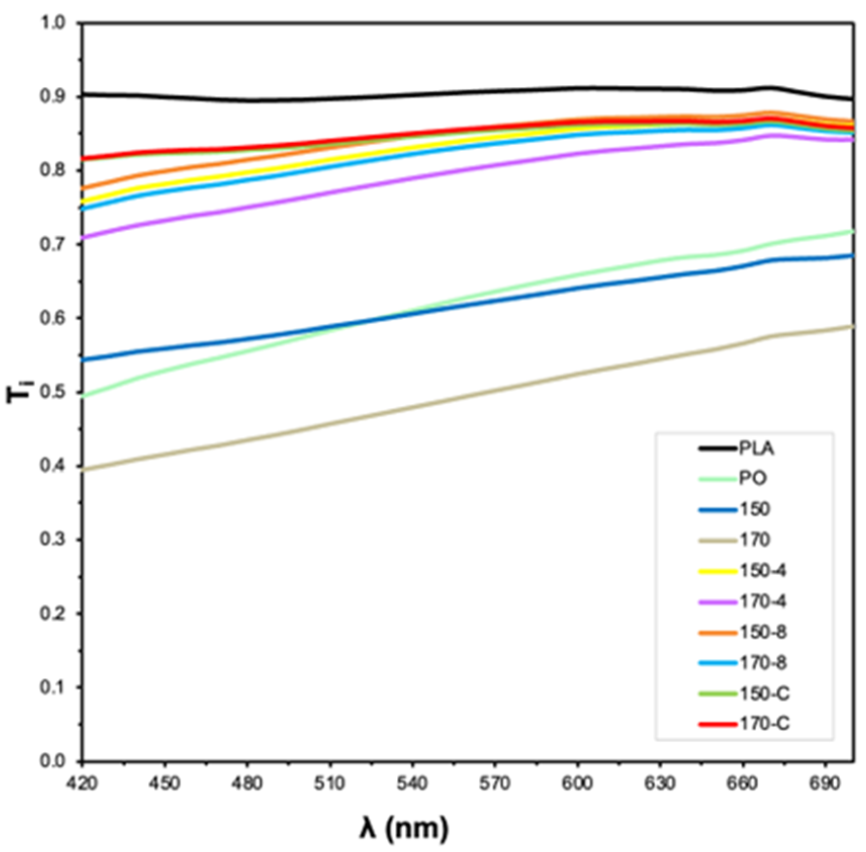 The film transparency is reflected in the internal transmittance (Ti) spectra shown in Figure 3. Incorporating fibres into the PLA films reduced the film transparency to different extents, depending on the cellulose purification degree. Ti decreased to a lower extent with the whitest fibres (chlorite-bleached), which did not show practically selective light absorption, only promoting the light scattering effect of dispersed particles in the polymer matrix. Fibres bleached with H2O2 produced a selective absorption at a low wavelength, mainly when the SWE extraction was carried out at 170 °C and bleaching was performed with 4% H2O2. The PO and 150 fibres provoked similar Ti reductions. In contrast, the 170 fibres produced a more marked reduction of Ti, in line with their lower WI resulting from the greatest formation of brown compounds during the SWE extraction at the highest temperature [7].