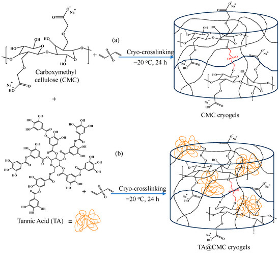 The schematic depiction of synthesis of (a) CMC-based cryogels and (b) TA@CMC cryogels.