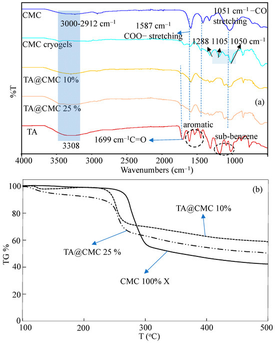 (a) FT-IR spectrum and (b) TGA thermograms of CMC, TA@CMC 10%, and TA@CMC 25% cryogels.