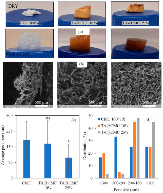 (a) Dry and water-swollen CMC, TA@CMC 10%, and TA@CMC 25% cryogels, (b) their corresponding SEM images, and (c) their average pore sizes, and (d) pore size distribution% comparison of CMC-based cryogels. ns: non-significant, * p < 0.05 compared with CMC cryogel as control group.