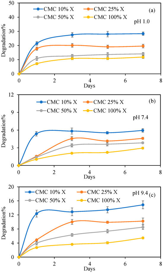 The degradability of polymers/hydrogels is another important parameter that affects the potential biomedical applications [46,47,48]. The intrinsic degradability of the biomolecule-derived crosslinked structures by enzymes, oxidative stress, and pH-sensitive environments in the body need to be taken into consideration. As a result, the hydrolytic breakdown of the cryogels based on CMC was studied at several pH solution values, 1.0, 7.4, and 9.0. These solution pHs were chosen due to their fit for multiple human systems and/or organs, such as the stomach, blood, intestinal pH, endosomal/lysosomal environment, and so on [49,50,51]. The hydrolytic degradation profiles of all CMC-based cryogels crosslinked with 10, 25, 50, and 100% crosslinking ratios at pHs 1.0, 7.4, and 9.0 are compared and shown Figure 4a, b, and c, respectively. The hydrolytic degradation profiles of CMC-based cryogels at pH 1.0 are given in Figure 4a. A higher degradation% was observed for CMC 10% cryogels; as 27.5 ± 1.6% of CMC 10% cryogels was degraded in 3 days and degradation increased slightly, 28.3 ± 1.2% degradation was observed up to 7 days. On the other hand, 19.6 ± 1.3, 14.1 ± 1.0, and 11.8 ± 1.00% of CMC cryogels were degraded, which were crosslinked at 25, 50, and 100%, respectively, in pH 1.0 at the end of 7 days.