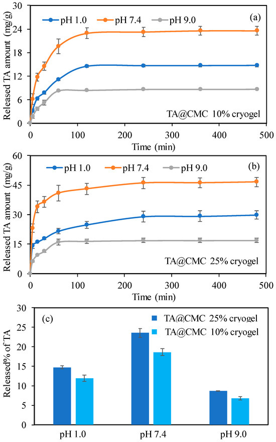 The TA-release profiles of (a) TA@CMC 10%, (b) TA@CMC 25% cryogels, and (c) released% of TA from TA@CMC 10% and 25% cryogels at pH 1.0, 7.4, and 9.0 at the end of 480 min.