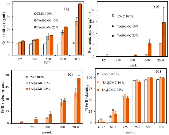 In Figure 6, the antioxidative capacities of TA@CMC cryogels were tested at varying concentrations according to four different antioxidant tests. In Figure 6a, the total phenol content of CMC cryogels at 2000 μg/mL is determined as 9.3 + 0.7, while for TA@CMC 10% and TA@CMC 25%, the total phenol contents, determined as 26.4 + 2.8 and for 39.8 + 0.5 ug/mL GA eq, respectively, are obtained at the same concentration. The total phenol content increases depending on the TA concentration. Figure 6b shows the total flavonoid content (TFC) according to rosmarinic acid equivalency where CMC cryogels have no antioxidant value. On the other hand, TA@CMC cryogels have a TFC dependency based on the TA content. At a concentration of 2000 µg/mL, TA@CMC 25% was determined by a TFC value of 23.4 ± 10.5 µg/mL RA eq, whereas TA@CMC 10% was administered at 9.2 ± 1.5 µg/mL RA eq at the same concentration.