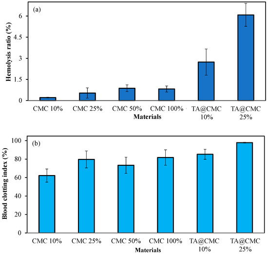 The blood compatibility of materials is of great value in biomedical applications [52,53,54]. The interactions of materials with blood need to be tested to assess the use of these materials in blood-contacting application. Commonly, the two-test hemolysis%, which is a measure of the red blood cell rupture capacity of the materials and the blood-clotting index% assay, which measure the effect on the blood coagulation mechanism of the materials are used to determine the blood compatibility of the materials [31,55]. Here, the hemolysis% values of 1 mg/mL concentrations of CMC-based cryogels were measured and compared in the results shown in Figure 7a. It is clearly seen that, with the increase in the crosslinking ratio from the 10 to 100% weigh ratio of CMC, there is a slight increase in the hemolysis% of CMC-based cryogels, e.g., from 0.21 ± 0.03 to 0.82 ± 0.21%, respectively. However, this increase is not important, and all CMC-based cryogels in the 10–100% crosslinked ratio are non-hemolytic as a <5% hemolysis ratio is defined as non-hemolytic [56]. On the other hand, the hemolysis% values were determined as 2.7 ± 0.9 and 6.1 ± 0.8% at a 1.0 mg/mL concentration of TA@CMC 10% and 25% cryogels, respectively. This means that the presence of TA within CMC cryogels affected the non-hemolytic nature of CMC cryogels, and the increase in the amount of TA in TA@CMC cryogels makes CMC-based cryogels slightly hemolytic at TA > 25 mg or capable of damaging the erythrocyte cells. It has already been reported in the literature that TA can destroy erythrocyte cells depending on their amount, resulting in hemolysis [31], yet ≤25 mg TA per gram of CMC cryogels can be considered non-hemolytic.