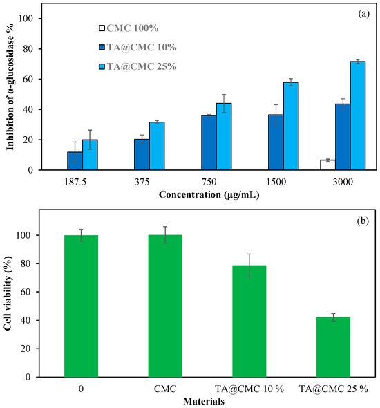 α-glucosidase is one of the hydrolytic enzymes that break down disaccharides’ bonds, and α-glucosidase inhibitors are used for type 2 diabetes. The enzyme inhibition of CMC-based cryogels is shown in Figure 8a. The CMC cryogels did not show any inhibitory effect on the enzyme; on the other hand, the TA@CMC cryogels inhibited α-glucosidase enzyme in a concentration-dependent manner. At a concentration of 1500 μg/mL, TA@CMC 10% inhibited the cryogel by 36.5 ± 6.5%, whereas the TA@CMC 25% inhibited it by 57.9 ± 2.4% at the same concentration and, upon increasing its concentration to 3000 μg/mL, the enzyme inhibition capacities are increased to 43.6 ± 3.8% and 71.6 ± 2.4%, whereas CMC had only 6.5 ± 0.2% α-glucosidase inhibition capacity.