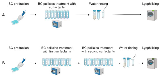 Schematic of the treatment protocols. (A) One-step treatment protocol and (B) two-step treatment protocol. In general, BC was produced over a 7-day culture period, then transferred to tubes to be treated with surfactants or various control conditions, followed by water rinsing and lyophilization. Created with BioRender.com.