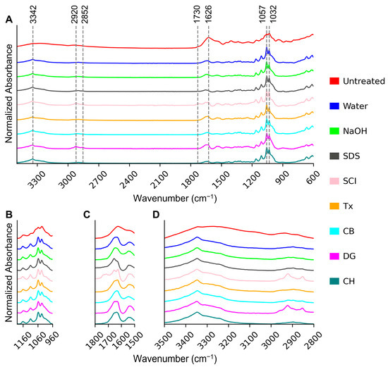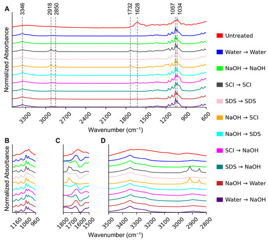 FTIR analysis of BC pellicles after treatment with the two-step treatment protocols or from untreated samples. (A) FTIR spectra for BC pellicles with specified regions associated with (B) C-O stretching, (C) amide bond and O-H bending, and (D) C-C stretching or CH2 asymmetric stretching in BC and C-H stretching in residual surfactant.