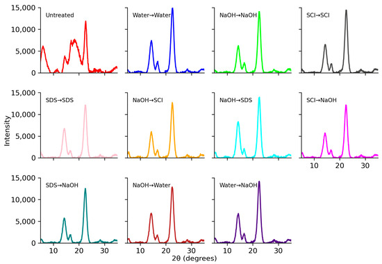 To further characterize the BC pellicles that underwent the two-step treatment protocol, XRD was performed to analyze the crystalline structure (Figure 6). Asymmetric least square baseline correction was implemented prior to XRD evaluation [66,67]. The XRD pattern of untreated bacterial cellulose demonstrated typical features of native cellulose, including the presence of both crystalline and amorphous regions. Despite the diversity in chemical treatments, the XRD patterns consistently displayed three principal peaks at approximate 2θ values of 14.2°, 16.6°, and 22.4°. These three peaks are characteristic of the (100) plane, (010) plane, and (110) plane, respectively, of cellulose Iα, or the (1–10) plane, (110) plane, and 200 (plane), respectively, of cellulose Iβ [68,69,70]. This uniformity suggests that the structural integrity of the cellulose’s crystallinity remained largely unaffected by the different treatment protocols. The observed broad peak at approximately 18.3° in untreated BC suggests a higher content of amorphous material or contaminants within the BC structure. Notably, this peak was absent in samples that underwent any of the two-step treatment protocols. Considering this, in addition to protein quantification, dsDNA quantification, and FTIR results, the broad peak was most likely attributed to bacterial contaminants within the untreated BC pellicles.