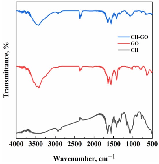 FT-IR analysis was carried out on CH, GO, and CH-GO to explore materials chemistry and to detect the functional groups available in the produced samples. Figure 3 reports the mentioned spectra.