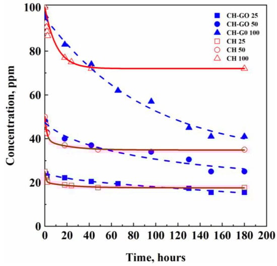 As far as the addition of graphene oxide is concerned, it shows a positive effect on MO uptake. However, such an effect can be appreciated once the driving force is increased since the experiments carried out at 25 ppm showed basically overlap with experimental points, as well as at equilibrium conditions. The explanation for this behavior can be associated with the effect of the driving force: if dye intrusion is limited by small concentration gradients, few MO molecules can diffuse inside the nanostructure. Therefore, there is no chance to establish more numerous adsorbate–adsorbent interactions, either with chitosan or graphene oxide active sites. On the other hand, when molecules are allowed to intrude into the nanostructure, the interaction between graphene oxide and MO is more likely to take place, showing the positive effect of compounding the filler within the chitosan structure. A graphical representation of the effect of driving force on MO uptake is reported in Figure 5.