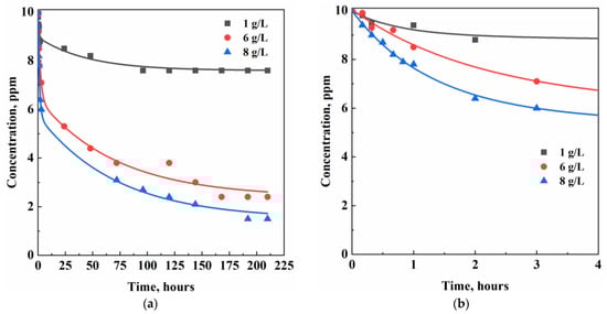 The effect of CH-GO dosage was studied on 50 mL of 10 ppm MO solutions, testing different adsorbent dosages, namely 1, 6, and 8 g/L. The MO concentration was selected because it is widely used as a reference in the scientific literature [,,]. MO concentration vs. time experimental points, collected for each dosage, are reported in Figure 6, in which an enlargement of the first 4 h is reported to appreciate the differences at small contact times. The equilibrium values and adsorption efficiencies related to each dosage are reported in Table 2.