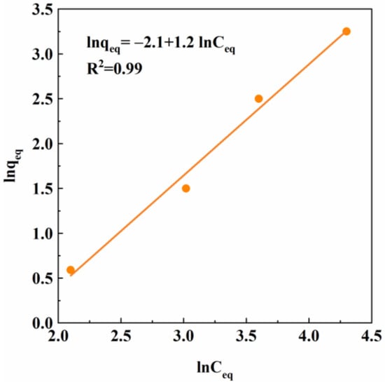 On the other hand, Freundlich isotherm describes much more accurately the behavior of the produced composite, although it does not allow the extrapolation of the maximum adsorption capacity. The data relative to Freundlich isotherm are reported in Figure 7.