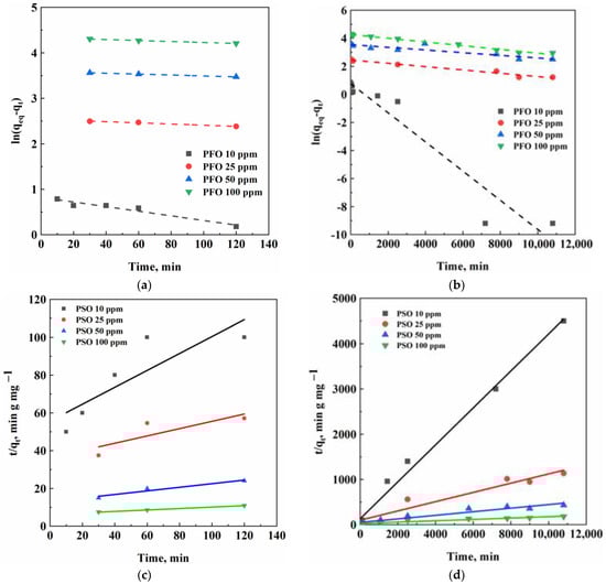 Kinetic points of (a) PFO up to 120 min; (b) PFO global; (c) PSO up to 120 min; (d) PSO global.