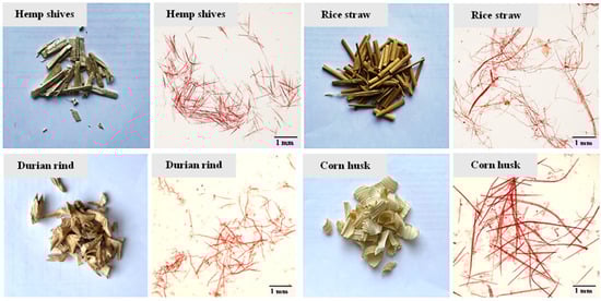 | Fiber Morphological Properties | Hemp Shive | Rice Straw | Durian Rind | Corn Husk |