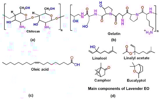 Chemical structure of (a) chitosan; (b) gelatin (adapted from []); (c) oleic acid; (d) lavender essential oil (adapted from []).