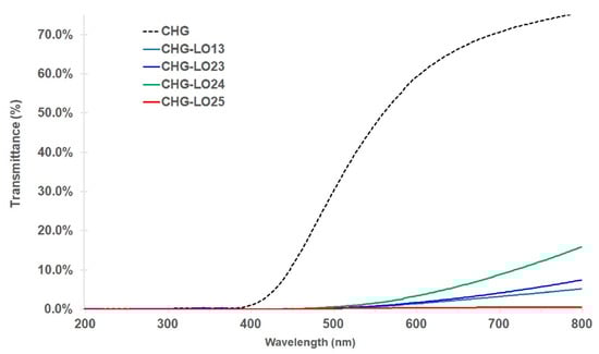As illustrated in Figure 3, the UV transmittance values in the range of 200–400 nm of all film samples decreased to 0.0–0.1% associated with UV absorbance characteristic of chitosan due to the existence of C=O double bonds and phenolic compounds of LO [], suggesting that they are effective UV absorbers. The transparency of CHG-LO films in the visible region between 400–800 nm exhibited a simultaneous decrease parallel to the increase in their opacity.