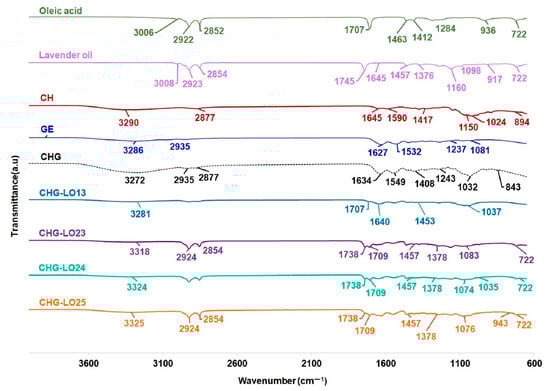 FTIR spectra of oleic acid (OA), lavender oil (LO), chitosan (CH), gelatin (GE), CHG control, and the CHG-LO films.