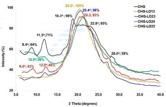 Figure 5 shows XRD graphs of CHG control, CHG-LO13, CHG-LO23, CHG-LO24, and CHG-LO25. The XRD analysis of the CHG control reveals a diffraction peak at 8.4°, due to the presence of the triple helical structure of gelatin, and two peaks at 11.5° and 18.3° corresponding to the relatively ordered crystal lattice of chitosan []. The broader band at 2θ = 20.0–24.2° is attributed to the characteristic of the partially amorphous and partially crystalline chitosan–gelatin matrix []. In the XRD patterns of CHG-LO13, CHG-LO23, CHG-LO24, and CHG-LO25, intensities of the peaks at 8.4°, 11.5°, and 18.3° decreased significantly as a result of the integration of nanoscale LO-OA micelles into the chitosan–gelatin matrices. However, the intensities of the peaks at 20.0–24.2°, associated with the network structure formed between the chitosan–gelatin chains and LO-OA micelles, demonstrated an increase, accompanied by a reduction in peak width in comparison to the CHG control, indicating an improvement in the partial crystallinity of the film samples in these regions. Similar XRD findings were reported by Pérez-Córdoba et al. for gelatin-chitosan films incorporated with tocopherol/cinnamaldehyde and garlic oil []. And Rubilar et al. for chitosan films with carvacrol and grape seed extract [].