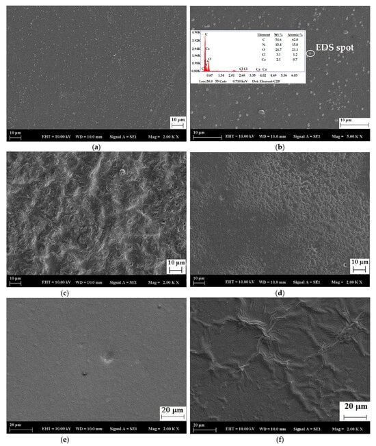 SEM images of: (a) CHG (×2000); (b) CHG (×5000) inlet: EDS spectrum of C, O, N, and Ca elements; (c) CHG–LO13 (×2000); (d) CHG–LO23 (×2000); (e) CHG–LO24 (×2000); (f) CHG–LO25 (×2000).