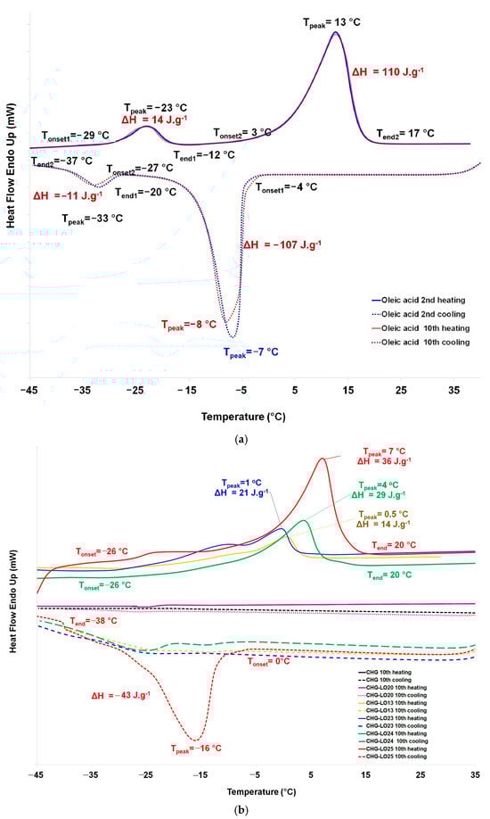 DSC curves obtained in the range of −45–35 °C at 10 °C.min−1. (a) Pure oleic acid for the 2nd and 10th heating-cooling cycle; (b) CHG, CHG-LO20, CHG-LO13, CHG-LO23, CHG-LO24, and CHG-LO25 for the 10th heating-cooling cycle.
