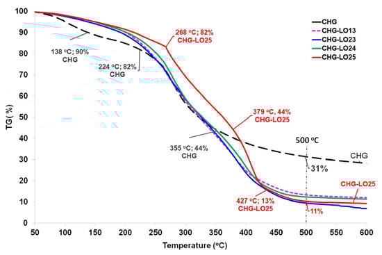 The thermal behavior of CHG control in the initial region was characterized by a 10% mass loss, during which the evaporation of residual water from the structure occurred at temperatures between 100 °C and 138 °C. The mass losses of the CHG film samples, which contained increasing amounts of LO and OA, remained at a level of 4–5% within the same temperature interval. This was attributed to the lower amount of water present in their structures [].