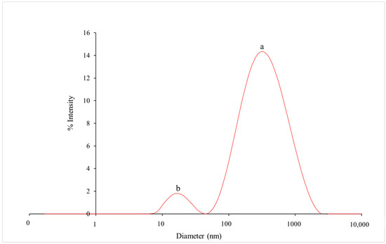 Figure 1 shows the particle size distribution of nanochitosan after ultrasonication treatment for 60 min. The nanochitosan exhibited a bimodal distribution; the predominant population of nanochitosan (95%) had an average diameter of 302.4 ± 92.3 nm, while the other had less intensity (≈15 nm) (Figure 1). The nanometric scale achieved by using ultrasound may be due to acoustic cavitation. This phenomenon creates bubbles or cavities that grow and implode, generating strong forces on the chitosan molecules. As a result, the 1,4-glucosidic bonds break, and the clumps produced by the Brownian motion of chitosan particles dissociate throughout the solution. Furthermore, the sonic waves increase the temperature, favoring chitosan’s depolymerization; this process causes chitosan to breakdown into smaller particles [28,29].