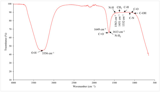 FTIR spectra of nanochitosan at a concentration of 2 mg mL−1 synthesized by ultrasonication–autoclaving.
