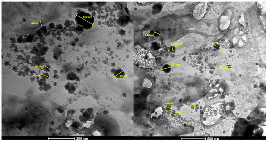 The size and shape of the chitosan nanoparticles are part of the characteristics that confer the biopolymer’s antimicrobial effect [40]. Transmission electron microscopy (TEM) analysis showed amorphous nanochitosan particles with sizes ranging between 30 and 200 nm. Figure 3 displays variations in the size of the population. The operation of the TEM equipment requires dry nanoparticle samples, resulting in the appearance of rough surfaces and a smaller particle size than that obtained by DLS, where the sample is used in suspension, which can lead to particle swelling and larger size.
