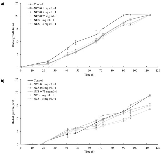 The data showed that nanochitosan caused a slight decrease in the development of mycelial during the first hours of growth of C. chrysophillum (Figure 4a). The same pattern was shown in C. musae; nanochitosan caused a reduction in radial growth, concentrations of 1 and 1.5 mg mL−1 showing the most significant impact (Figure 4b).