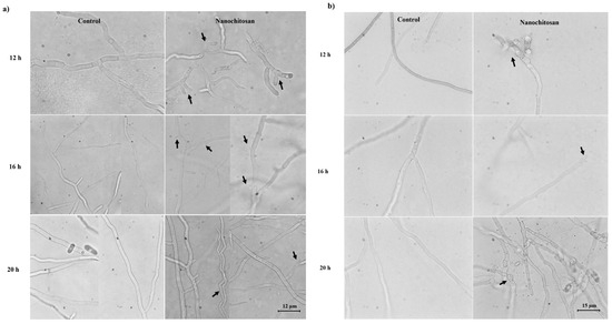 Mycelial growth of control and nanochitosan (1 mg mL−1) at 25 °C. (a) C. chrysophillum and (b) C. musae. Images taken at 400× magnification. The arrows in the image indicate anomalies in the morphometry of the hyphae caused by the nanochitosan.