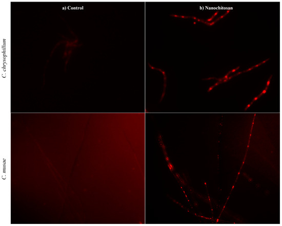 In the nanochitosan (1 mg mL−1), the cell walls of C. chrysophillum and C. musae were distorted, granulated, and had a lower fluorescence intensity (Figure 8). The fungal cell wall contains glucans and chitin that maintain its integrity and structure [51]. Calcofluor white allows us to see if the chitin–calcofluor or chitin–glucan interaction changes the way these polysaccharides are spread out. Likewise, chitosan has been shown to exert fungal intracellular activity and affect the expression of proteins that maintain cell wall integrity [52]. Previous studies on Fusarium oxysporum and Aspergillus parasiticus observed morphological and microstructural changes caused by chitosan and caused by alterations in the content of hydrolysis proteins or chitin and glucan synthesis, which were evidenced by the intensity of calcofluor staining [26,51]. Therefore, it can be hypothesized that the morphological and growth alterations in C. chrysophillum and C. musae exposed to nanochitosan are manifested by alterations in the expression of cell wall proteins. However, further research is needed at the gene expression level to detect the specific action of chitosan on the cell surface of fungi such as Colletotrichum.