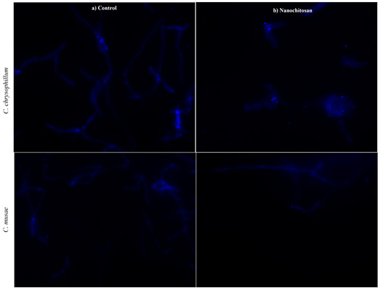 Cell wall analysis with calcofluor white fluorescence staining in C. chrysophillum and C. musae hyphae. (a) Cells without nanochitosan and (b) cells with nanochitosan at concentration (1 mg mL−1). Visualization of fungal cell walls in the presence of nanochitosan, showing low blue intensity and distortion of the hyphal septum, showing a compromised cell wall.