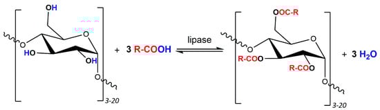 - van den Broek, L.A.M.; Boeriu, C.G. Enzymatic synthesis of oligo- and polysaccharide fatty acid esters. Carbohydr. Polym. 2013, 93, 65–72. [Google Scholar]