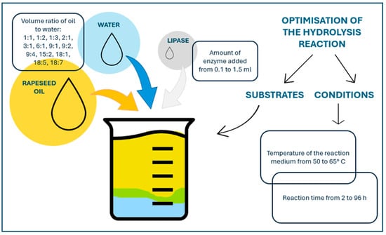 Reaction optimisation was carried out by selecting the appropriate oil/water volume ratio, amount of enzyme added, reaction time, and reaction temperature. An appropriate water/oil ratio and a magnetic stirrer were introduced into a glass bottle with a tight cap. The bottle was placed in an insulated water bath with a lid, equipped with a magnetic stirrer, and once the system reached the set temperature, the specified amount of lipase was added to the bottle. The entire system was incubated in a water bath with continuous stirring. The optimisation conditions are shown in Figure 2.
