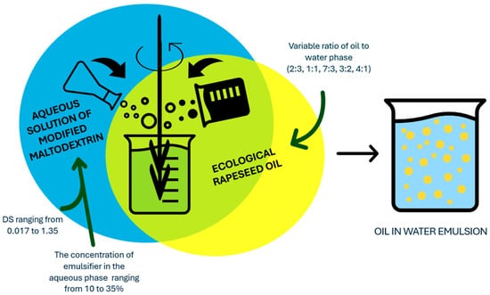 The emulsion preparation proceeded as follows. The procedure started with the preparation of aqueous solutions of maltodextrin esters (with DS values from 0.017 to 1.35) at identical concentrations of 25%, then rapeseed oil was added to the resulting solutions at a volume ratio of 1:1 (oil phase: water phase) and each mixture was homogenised for 1 min using an IKA T-25 digital ULTRA TURRAX homogeniser (IKA—Werke GmbH & Co. KG, Mindelheim, Germany) at a rotational speed of 5000 rpm. Subsequently, a series of emulsions was prepared for an ester with DS = 0.024 (ester concentration in the aqueous phase equal to 25%) using different volume ratios of oil to aqueous phase (2:3, 1:1, 7:3, 3:2, 4:1). In the final step, emulsions based on esters with DS ranging from 0.017 to 0.038 and oil/water phase ratios of 1:1 and 3:2 were prepared using different concentrations of ester in the aqueous phase (from 10 to 35%). The resulting emulsions were transferred into containers with screw caps. For each maltodextrin ester-based emulsion made, an emulsion based on the corresponding unmodified maltodextrin was comparatively made. Detailed emulsion preparation conditions are shown in Figure 3.