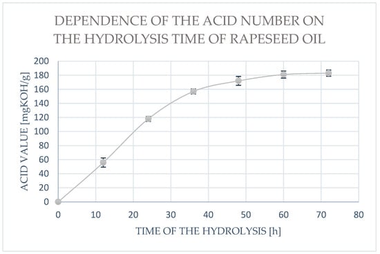 The dependence of the acid number on the duration of enzymatic hydrolysis of rapeseed oil. Data presented in the diagram are mean values (mean ± SD, n = 3).