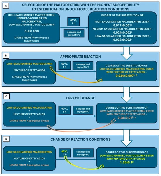 Scheme illustrating the course of all esterification steps including the results of the degree of substitution: (A)—for a model reaction using low-saccharified maltodextrin, medium-saccharified maltodextrin, high-saccharified maltodextrin, pure oleic acid and lipase from Thermomyces lanuginosus; (B)—for a reaction in which pure oleic acid was replaced by a mixture of fatty acids obtained from the hydrolysis of rapeseed oil; (C)—for a reaction in which the lipase from Thermomyces lanuginosus was replaced by a lipase from Aspergillus oryzae; (D)—for a reaction in which the reaction conditions were changed (lower temperature). Data presented in the diagram are mean values (mean ± SD, n = 3). Mean values marked with different letters are significantly different at p ≤ 0.05.