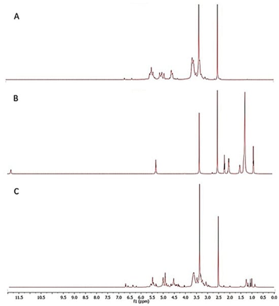 1H NMR spectra of (A) native maltodextrin, (B) oleic acid and (C) esterified maltodextrin.