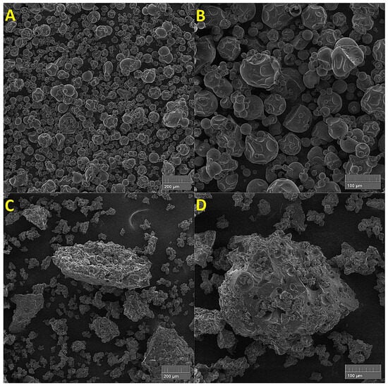 However, maltodextrins with the same DE value may also have different properties depending on the hydrolysis procedure, source of starch (maize, wheat, potato, rice), and amylose to amylopectin ratio []. Maltodextrins with lower DE values have properties more similar to those of the starch from which they are derived. As the degree of substitution of maltodextrins increases, their crystallinity and swelling capacity decrease and their hygroscopicity and solubility increase []. Unmodified maltodextrins are often used as thickening agents, fillers, and carriers in the food industry and as binding agents in pharmaceuticals [,].