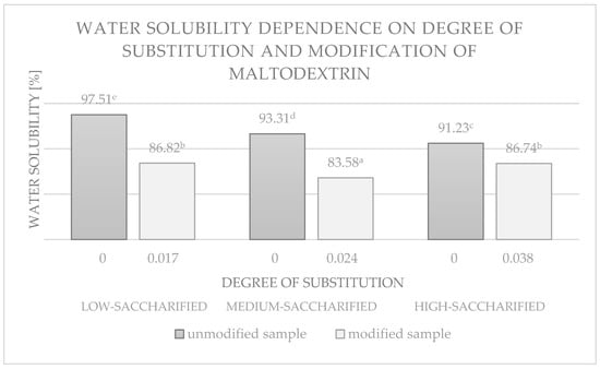 In a pre-weighed centrifuge test tube, 0.5 g of unmodified/esterified maltodextrin was weighed on an analytical balance and suspended in 30 mL of distilled water. A stirrer was then placed in the tube with the suspension and stirred on a magnetic stirrer for 30 min. After this time, the sample was centrifuged (9000 rpm, 20 min). The supernatant was decanted into a previously dried to dryness and weighed crystalliser and dried at 105 °C for 24 h. The sample was then cooled to room temperature and weighed. The tube with the supernatant sediment was also weighed on an analytical balance. The determination was performed at 25 °C and repeated three times for each sample tested.