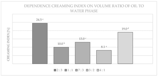 The lowest creaming index (0.0%) was obtained for an emulsion prepared on the basis of low-saccharified maltodextrin ester with DS = 0.038 for an ester concentration in the aqueous phase equal to 35% and a volume ratio of oil to water phase equal to 3:2.