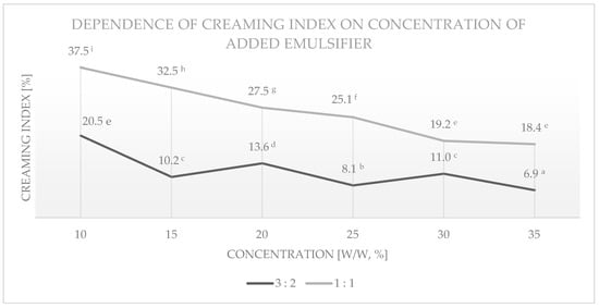 The creaminess indices of emulsions (shown in Figure 15) prepared for a ratio of 1:1 showed a clear dependence on the concentration of the added emulsifier—an increase in the concentration of the ester influenced a decrease in the creaminess index. In this case, the best result was achieved for a sample containing 35% maltodextrin esterified in the aqueous phase. In the case of an oil to water phase volume ratio of 3:2, samples with an emulsifier content of 15, 25, or 35% showed the greatest stability. Emulsions prepared for a volume ratio of 3:2 showed higher stability than emulsions prepared for a ratio of 1:1 for all concentrations tested.