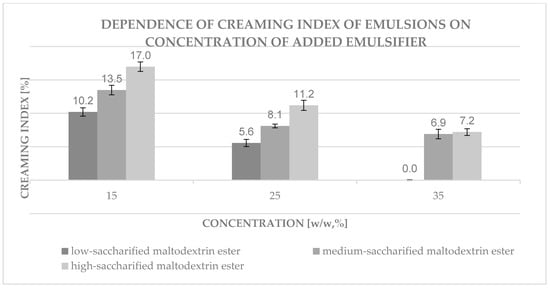 In the case of emulsions obtained on the basis of maltodextrin esters with different degrees of saccharification (shown in Figure 16) obtained under the same conditions but differing in the degree of substitution (low-saccharified maltodextrin ester with DS = 0.038, medium-saccharified maltodextrin ester with DS = 0.024, high-saccharified maltodextrin ester with DS = 0.017), the following relationship was observed—a higher degree of substitution leads to a more stable emulsion. The trend of the decreasing value of the creaming index with increasing emulsifier content was also preserved.