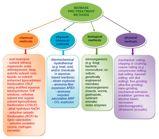 Biorefinery, an emerging wholistic concept in biomass processing, involves the efficient conversion of renewable biomass into biofuels and chemicals. It evolves in stages: firstly, the effective fractionation of biomass into its main constitutive polymers, namely cellulose, hemicelluloses, and lignin; and secondly, the sustainable hydrolysis of cellulose to monosaccharides, mainly glucose. This process represents the most important entry point into a biorefinery scheme based on polysaccharides [2,21,22,23,24]. Figure 1 gives a schematic overlook of the main strategies used for biomass pre-treatment [25,26,27,28,29,30] in order to overcome its low chemical reactivity and facilitate access to its main structural polymer components, mainly cellulose. As a consequence, it becomes much easier to valorize these materials through biorefining approaches.